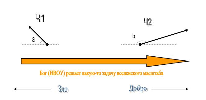 Человек, который имеет искажённое понимание о мироустройстве (либо у него недостаточно опыта в оценке причин и следствий различных событий, либо понимание искажено религиями, идеологиями, СМИ и т.п.) и у которого плохо развито чувство Меры, может совершать поступки, идущие вразрез с надеждами Бога в отношении человечества. Соответственно он является силой (одной из), тормозящей Единение человечества и жизнь в русле Божьего промысла. То же самое касается сущностей других, тонких миров. Графически можно изобразить вот так: http://forum.kpe.ru/attachment.php?a...1&d=1240063438 Где Ч1, Ч2 - два разных человека. Вектор совокупности действий Ч2 направлен в соответствии с целями Бога соответственно его мере миропонимания. Вектор совокупности действий Ч1 направлен в противоположном направлении. Угол "а" показывает довольно плохую меру понимания целей и законов Бога. Угол "b" показывает довольно хорошую меру понимания целей и законов Бога. Человек, защищающий безнравственную толпо-элитарную систему мироустройства, при которой "умники" господствуют над "быдлом" (которое эти же "умники" и опускают), действует против воли Бога, работая на разъединение человечества. Религиозный (или идеологический) фанатик может руководствоваться благими намерениями, но с высоты 6 приоритетов ОСУ он действует против воли Бога в силу своей неполной меры понимания происходящих процессов. Всё-таки рекомендую ознакомиться с лекциями по КОБ и ДОТУ. |