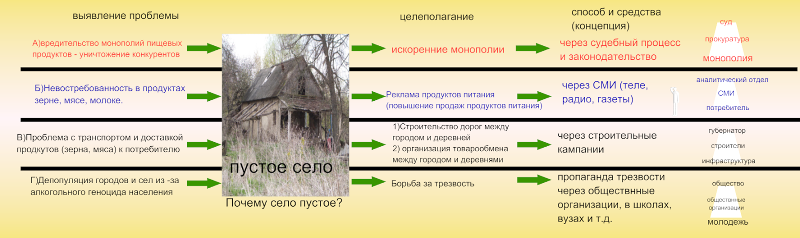 ![]() ![]() Здесь показано что в управлении определяющим этапом является первый этап - выявление проблемы (фактора среды). Если первый этап ошибочен, т.е. проблема выявлена не правельно , то последующие этапы ПФУ (в т.ч. и целеполагание) - бессмысленны. Более того на этом рисунке красным тестом обозначена реальная проблема , которая приводит например к убавлению численности сельского населения, черным текстом - вторичные проблемы, которые тоже имеют место, а вот синим текстом - ФИКТИВНАЯ т.е. несуществующая проблема. Другими словами хозяева продуктовых монополии очень заинтересованы в том, чтобы люди не видели "красной строчки" т.е. настоящей проблемы а сосредоточили все свое внимание на синей и черных строках. И здесь каждый в меру своего понимания - работающие над фиктивной проблемой о "Невостребованности отечественного зерна, мяса, молока" сами того не понимая не только не решают реальной проблемы, но и еще работают на раскрутку продукции продуктовых монополий.