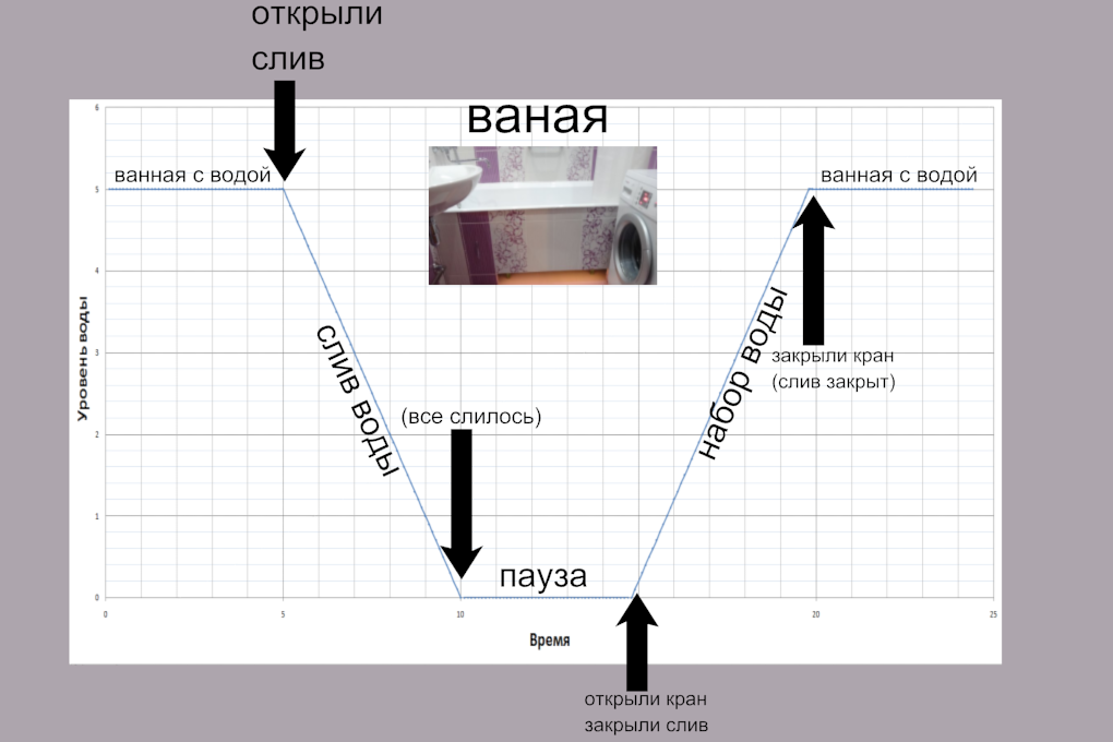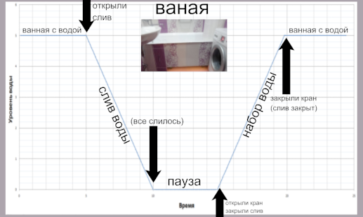 Пример 1 ![]() http://1.bp.blogspot.com/-5yfHAYbSRd...%B3%D1%801.png На этом графике в условных координатах изображен уровень воды в ванне (или в бассейне/цистерне и др.) в зависимости от времени. По нему можно сказать когда ванна была наполнена , что происходило, когда сливалась вода, когда ванна снова наполнялась - смотря на этот график можно понять что происходило - выявить процесс - слив воды и зафиксировать время управляющих воздействий. Пример 2 ![]() http://2.bp.blogspot.com/-EceFO_n5DX...%B3%D1%802.png Здесь показано расстояние машины от заправки и скорость движения машины в зависимости от времени. На нем видно когда машина начала тормозить, развернулась и поехала в обратную сторону и когда она вернулась в заправке. Пример 3 ![]() http://3.bp.blogspot.com/-xwSNFpD7A9...%B3%D1%803.png На этом рисунке показана урожайность картофеля на 1 Га земли и ее изменение по времени (от годов сбора урожая). Плавная линия (голубая пунктирная) - постепенный спад урожайности из - за истощения почвы. Красная линия с колебаниями та же что и голубая но с учетом колебаний урожайности в зависимости от изменения активности солнца. В верху графика желтая синусойда - в условных координатах - колебание солнечной активности. Проседание синей линии до нуля - отсутствие урожайности из - за колорадского жука. и в правой части графика резкий скачек фиолетовой линии в верх - повышение урожайности в следующем году - перекопка истощающегося участка с черноземом, повышающим урожайность. Пример 4 ![]() http://1.bp.blogspot.com/-1SbhWNdf9h...0%B6%D0%B0.png Этот рисунок - общий объем продаж магазина в условных руб/день. С момента открытия магазина объем продаж увеличивался и должен был достигнуть насыщения, однако затем он быстро упал на половину. Т.е. процесс роста посещаемости магазина понес ущерб - а источник ущерба - появления серьезного конкурента. При этом весь объем продаж состоит из суммы продаж: Мясо+рыба+молочные+крупы+овощи. При этом после спада - ПРОПОРЦИИ в продажах тоже изменились - прежде всего пострадала торговля рыбой и мясом - их доля сильно упала. После чего делается вывод- конкурент- поставщик прежде всего мясной и рыбной продукции. Тут важно иногда следить и за изменением других параметров, например за уровнем населения в поселке/город/районе, ведь спад продаж может быть и результатом оттока населения из этого места, НО тогда спад объема продаж будет равномерным и медленным (т.е. пропорции в продажах: мясо+рыба+молочные+крупы+овощи останется прежним)
