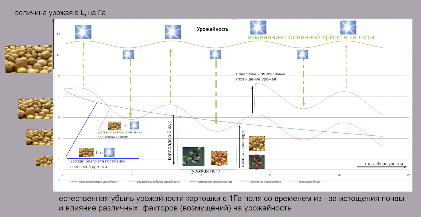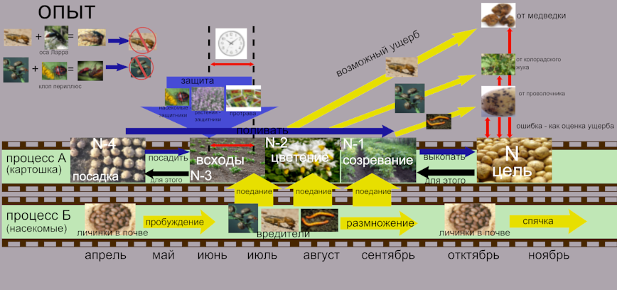1) Есть некий процесс которым мы хотим управлять и у него есть желаемые и нежелательные конечные состояния. 2) Есть идеальный режим управления процессом (без возмущающих воздействий) который формируется пошагово тем же методом динамич. программирования от конечного состояния вспять к начальному, дорисовывая как объективно возможные промежуточные состояния, так и конкретные шаги (управляющие воздействия) между этими состояниями 3) Есть процессы - вредители затрагивающие управляемый процесс, которые своими возмущениями могут привести наш процесс к нежелательному конечному состоянию. 4) Есть опыт и предвидение множества недопустимых состояний процесса, и способов компенсации возмущений. ![]() http://3.bp.blogspot.com/-KCNAJMUgz2...%BE%D1%832.png Пример - опять самый понятный и бытовой 1) Управляемый процесс - выращивание картошки , желаемое состояние - большой урожай, нежелательное конечное состояние - отсутствие урожая. 2) Идеальный режим - посеял , поливеашь, через несколько месяцев собираешь большой урожай, погода устойчивая, теплая, насекомых- вредителей нету. 3) Вредный процесс - размножение насекомых - жрущих корнеполоды, которые могут пожрать весь урожай (колорадский, медведка, проволочник,и др.) 4) Есть опыт борьбы с насекомыми и предвидение того, когда эти насекомые проснуться, выползут из земли, и начнут жрать урожай + есть знание о том насколько РАНЬШЕ до пробуждения вредителей надо оказывать воздействие на них (и вредные процессы), чтобы УСПЕТЬ скомпенсировать возмущение. - Короче насколько раньше до появления насекомых - вредителей нужно обрабатывать картошку, разводить др. насекомых - защитников или сажать растения - защитники, отпугивающие вредителей, так чтобы на выходе был в идеале нетронутый урожай.
