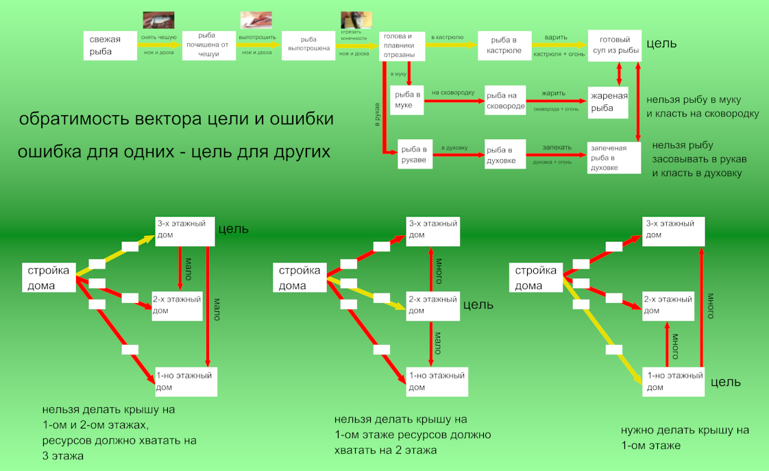 ![]() При этом в "Ромбиках" - операторах условного перехода - содержательная часть - СРАВНЕНИЕ того что достигается в промежуточных шагах с целевыми функциями, т.е. вектор ошибки управления, разбитого на несколько этапов (шагов). Прямая связь (шаг или действие) + обратная связь, отвечающая как "НЕТ" на каждый из вопросов в ромбиках формируют циклический процесс достижения на данном этапе целевых функций, короче - обнуление частных векторов ошибки. Единственное в этом примере я не стал расписывать количественные характеристики (типа сколько конкретно надо приготовить котлет. сколько нужно мяса и т.д.) они просто по умолчанию в самих ромбиках.