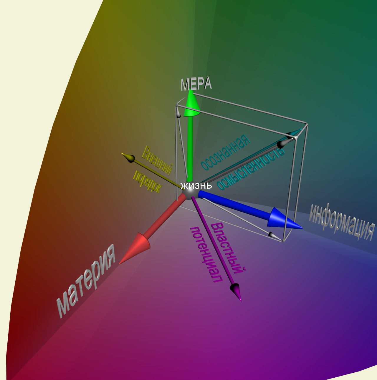 Рассмотрим теперь самое главное для человека "НЕЧТО" - его жизнь. Иносказательно в моих образах - Жизнь протекает в объеме и ее потенциал это объем куба, т.е произведение (информированность)*(Мера осознанности)*(подчиненные ресурсы - материя)