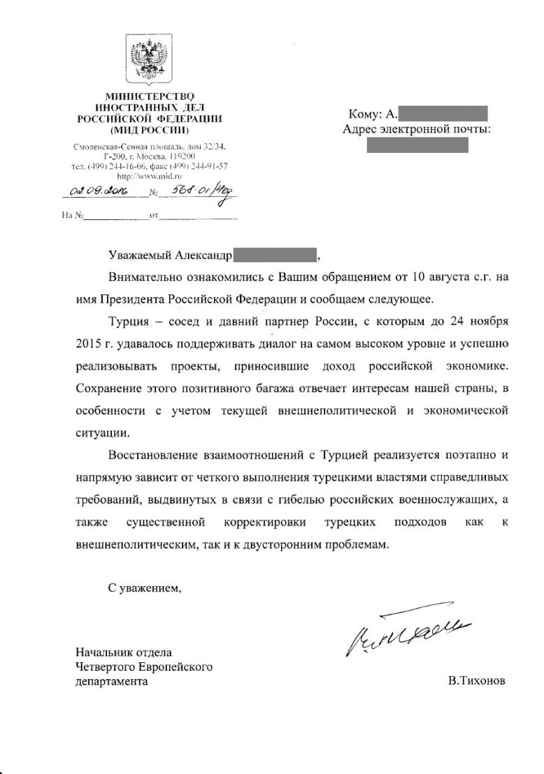 Написал президенту письмо по поводу турции и так называемых "извинений".