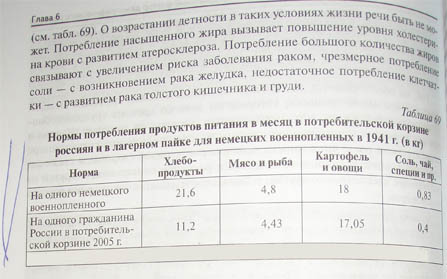 "Государственная политика вывода России из демографического кризиса". Объёмный научный труд. Много интересных цифр. Приведу одну табличку: Нормы потребления продуктов питания при кровавом Сталинском режиме - в лагерном пайке военнопленных в 1941 году, и "дорогих Россиян" при победившей демократии в 2005 году. ________в килограммах____Военнопленный(1941)__ГражданинРФ(2005) Хлебопродукты__________________21,6________________11,2 Мясо и рыба ____________________4,8_________________4,43 Картофель и овощи ______________18_________________17,05 Соль,чай,специи и пр.____________0,83_________________0,4 |
