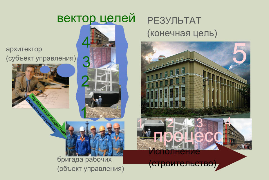 Главная цель - построить здание школы (заказчик дает архитектору задание). Архитектор понимая конечную ЦЕЛЬ вырабатывает ВЕКТОР ЦЕЛЕЙ - как последовательность этапов преобразования ресурсов в ходе строительства. Геометрические размеры и планировка комнат это всего лишь часть целеполагания (хотя конечно очень важная). После четкой выработки стратегии архитектор оказывает управляющее воздействие на бригаду, поясняя стратегию а дальше - исполнение и САМ процесс строительства, по завершении - результат.