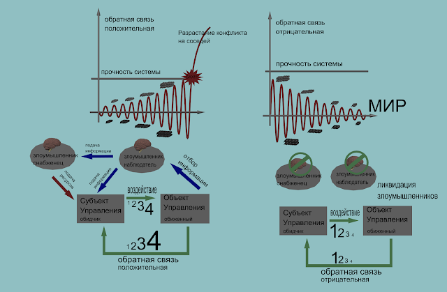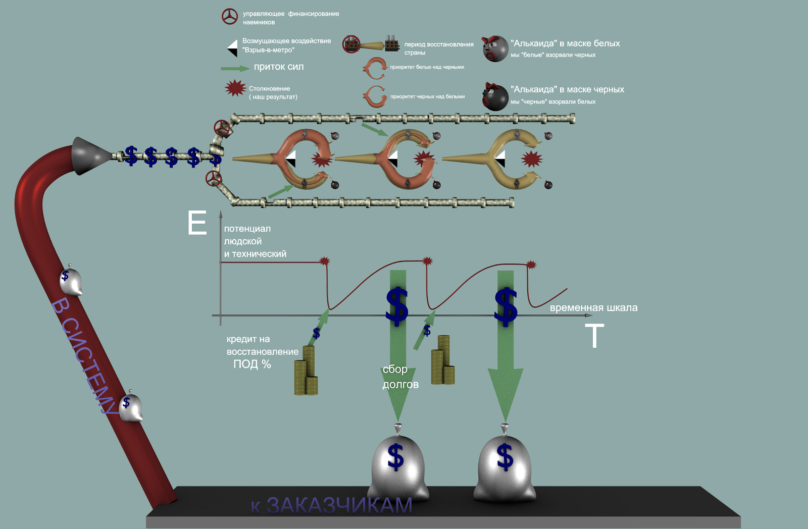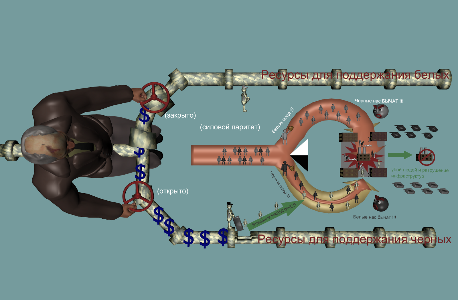 по библейской концепции "Разделяй и властвуй": 1) Хотим чтобы объект управления (Страна Х) была максимально предсказуемой и на любое наше управляющее воздействие СТРАНА Х откликалась 100% предсказуемо (т.е чтоб в этой стране общественные события развивались по предсказуемым сценариям) 2) Для этого надо полностью ПОДЧИНИТЬ данную страну диктаторам (тиранам, не важно) - своим ставленникам (прямым или опосредованным) 3) Для этого надо заставить ЭЛИТУ страны безприкословно подчинятся нашим интересам и нашим ставленникам либо уничтожить эту элиту и привести к власти ЭЛИТУ №2 более послушную для нас 4) для этого надо ослабить защитные функции самой страны, путем СОЗДАНИЯ политического, силового (социального) хаоса, который бы ослабил управленческие функции непослушной нам элиты и СДЕЛАЛ БЫ НЕРАЗБЕРИХУ В ТОМ КТО ДРУГ А КТО ВРАГ, желательно на всех общественных уровнях от самой элиты до последних заблеванных бомжей (ну понятно, что через такую неразбериху легче привести оппозиционеров-ставленников ко власти, а всех сопротивляющихся этому СТАЛКИВАТЬ лбами друг с другом, СВОЕВРЕМЕННО "указывая на врагов") 5) для создания такой неразберихи надо начать с чего - то малого, легко подконтрольного нам, а затем эту МУХУ раздуть до слона, т.е при помощи НАЕМНИКОВ террористов (разных "Алькаед") к примеру организовать взрыв в метро и провозгласить это как "МЕСТЬ" т.е. от имени "Алькаеды белых/черных" как "святую" месть черным/белым. Др. словами Белым мы будем показывать что "Метро взорвали черные" А черным, что "Метро взорвали белые" Создается внутри страны общественная напряженность ===> уличные побои (с подкупленными отморозками) , ну и далее по ящику показываем и показываем все нарастающие стычки , создаем истерику в СМИ, ну и т.д. Ну а дальше все показано на картинке выше... |