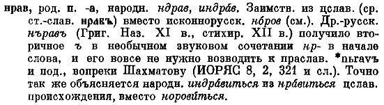 род. п. -а, народн. ндрав, индрав. Заимств. из цслав. (ср. ст.-слав. нравъ) вместо исконнорусск. норов (см.). Др.-русск. нъравъ (Григ. Наз. ХI в., стихир. ХII в.) получило вторичное ъ в необычном звуковом сочетании нр- в начале слова, и его вовсе не нужно возводить к праслав. *nьravъ и под., вопреки Шахматову (ИОРЯС 8, 2, 321 и сл.). Точно так же объясняется народн. индравиться из нравиться цслав. происхождения, вместо норовиться.