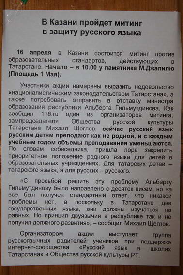 Как житель Татарстана, могу подчеркнуть, что большинство граждан испытывают именно языковую неприязнь в первую очередь. Можно уважительно относится к человеку, можно дружить и иметь общие интересы, есть чак-чак и слушать циганские романсы, но что касается языковой общности, здесь нет дружбы, и возможна ли. И не кривя душой скажу, никакой дружбы народов здесь особо не пахнет. Попытка оправдать дружбу огромным количеством смешанных браков, терпит сильную неудачу и ведет к ещё большему разочарованию, самих бракосочетающихся.Опишу кратко, что вообще происходит с языком на месте. Ранней версией письменности, у татар является арабская вязь, как заявляют. А само упоминание о татарах с VIII века. Вопрос, а что было до этого. Иначе татар можно отнести к Арабам. Затем в обиход вошла латиница и кирилица, правда не в привычном для всех виде. И даже три-четыре поколения назад люди бы спросили что это за язык. Последний раз попытка вернуться к латинице для всего населения Татарстана, замечу не татар, русских, чуваш, а для всех, была ещё большим косяком. Вот что из этого получилось Муштари.jpg. Снизу надпись по-русски, сверху надпись на иностранном языке. Нет я не оговорился. Официально последний принятый алфавит татарского языка был таким http://www.primavista.ru/rus/diction...tarsky_alfavit.Что же касается объявления остановок в транспорте, то: сначала он звучит на чистом английском, затем на русском и потом на татарском. Кондукторы правда озвучивают как умеют. Как видим налицо взращивание и раздутие этносов, только среди татар сегодня некоторые называют до 40 обособляющихся групп. Плюс попытка закрепление за ними территориальных притязаний. Тоже с другими национальностями. Очень сильно раздувается миф о многочисленности той или иной нации. Замечу знание языка и общение на нём еще не говорит о принадлежности к национальности. Но именно так они формируются. За счёт чего это происходит в Татарстане? За счет уменьшения уроков русского и литературы, математики и истории и возможно других предметов, с заменой их на количество часов английского языка и татарского ("неоязыка"). Предмет "история" переписывается под неоязык. Также отметим, что взяв на вооружение ислам как основополагающую религию, а там предпочтение словесной форме передачи информации, письмо считается искажением, другие языки должны отвергаться. Это не заставило себя ждать. Собственно за что и стали страдать религиозные деятели. Вот так хитро с рождением ислама оставили лазейку для стравливания народов на религиозной почве. Можно сказать, что там, где ислам нет место языкам нетюрской группы. Причём в быту люди продолжают пользоваться и арабской вязью и модифицированной кирилицей. И Предложения преобретают вид: треть на тюрском (уже довольно-таки обобщенная форма), треть на русском, треть на английском, ну а с прибыванием других народов еще и без внятных окончаний. КЛОУНЫ! Естественно в этом цирке ставятся и другие спектакли. В школах и вузах готовят клоунов готовых продолжить дело, и это сильно заботит их родителей. Вот о чём письмо незадачливого клоуна, к главному шуту республики.