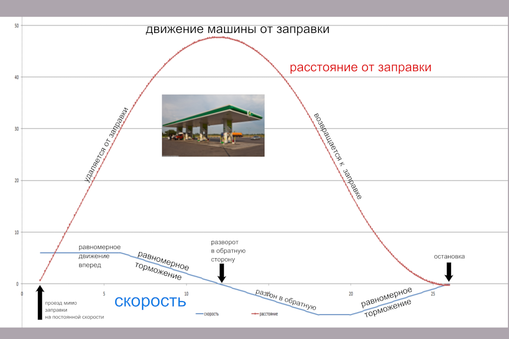 Здесь показано расстояние машины от заправки и скорость движения машины в зависимости от времени. На нем видно когда машина начала тормозить, развернулась и поехала в обратную сторону и когда она вернулась в заправке.