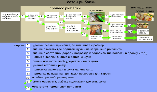 Мой субъективный пример изображения метода динамического программирования процесса рыбалки разбитого на несколько ключевых состояний с описанием необходимых шагов перехода между этими состояниями.