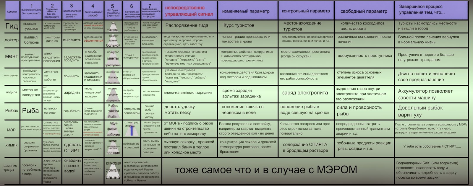 ![]() При этом в "Ромбиках" - операторах условного перехода - содержательная часть - СРАВНЕНИЕ того что достигается в промежуточных шагах с целевыми функциями, т.е. вектор ошибки управления, разбитого на несколько этапов (шагов). Прямая связь (шаг или действие) + обратная связь, отвечающая как "НЕТ" на каждый из вопросов в ромбиках формируют циклический процесс достижения на данном этапе целевых функций, короче - обнуление частных векторов ошибки. Единственное в этом примере я не стал расписывать количественные характеристики (типа сколько конкретно надо приготовить котлет. сколько нужно мяса и т.д.) они просто по умолчанию в самих ромбиках.
