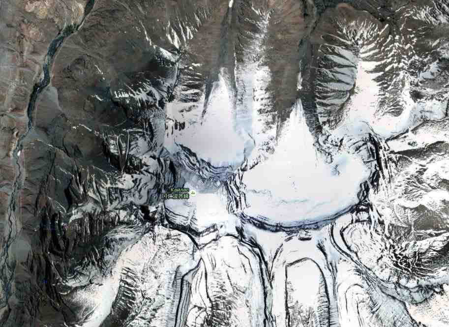 На иллюстрации "Вид Кайласа сверху" оси отложены не с вершины Кайласа. Вершина немного левее, как видно по тени отбрасываемой вверх (т.к. свет идёт с юга, снизу).