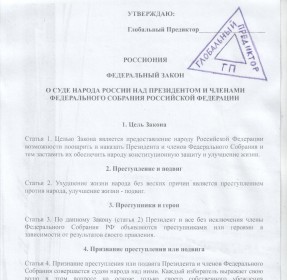 Далее. Поклоняешься четыреединому Аминю - Аному - Амуну? Ты сторонник КОБ? КОБ тогда зачем? Если закон с громким названием "О Суде народа" (при этом "суд" с большой буквы, а "народ" - с маленькой) "как раз и является идейной концепцией, которая даст толчок для вхождения в политическую жизнь всему народу", то кто же, по твоему, будет его принимать, это закон? Кто будет "толкать" "весь народ"? По твоему, народ ещё не "толкнутый", и его ещё только надо приобщить к политической жизни. Хорошо. Кто тогда для начала его толкнёт к принятию этого самого закона? Вот с этого надо начинать, сначала. Нет никакого механизма принятия и реализации этого закона.