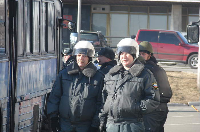 Сотрудников милиции на площади было много. Часть из них стояла на краю площади и дороги, проходящей рядом с площадью, организуя таким образом оцепление площади. В противоположных концах площади находилось по два автобуса на 40 посадочных мест, в которых находились бойцы в касках, брониках, вооруженные дубинками. Плюс, на самой площади стояло пять «бобиков», и небольшой автобус тоже экипированных бойцов.