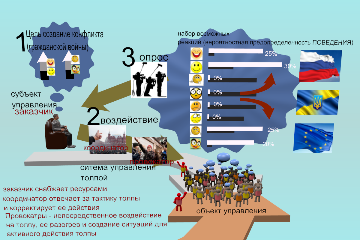![]() Это и есть управление массовыми явлениями, где поведение толпы, ВЫРАЖАЕМОЕ набором возможных реакций ЕСТЬ ОБЪЕКТ УПРАВЛЕНИЯ со стороны того кто подает информацию массам людей преследуя проще говоря одно - ИЗМЕНЕНИЕ такого набора реакций (настроения масс) так чтобы оно не мешало а еще лучше сопутствовало осуществлению целей субъекта. И так если богатенький субъект собирается построить грязный и засирающий завод в поселке или городе то ему сначала следует запустить информацию и разрекламировать постройку завода так, чтобы оное выглядело благодетелем в глазах значительной части масс. Тут представлена классическая спираль (мера) циркуляции информации и ее ключевые точки: 1- подача информаци 2 - опрос массы людей 3 - анализ и вывод для дальнейших действий. Каждая последующая подачка информации опирается на предыдущий опрос мнений , анализ и вывод.