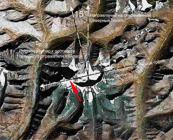 На иллюстрации "Вид Кайласа сверху" оси отложены не с вершины Кайласа. Вершина немного левее, как видно по тени отбрасываемой вверх (т.к. свет идёт с юга, снизу). При ориентировании на север по карте Google видно, что плоскость северной грани смотрит не влево от севера, а скорее вправо. На сколько верны карты Google не берусь утверждать, но это несоответсвие показывает как всё-таки очень критически нужно относиться ко всем материалам. |